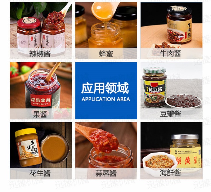 辣椒醬灌裝機(jī)采用活塞式灌裝原理,適用于調(diào)味品中帶顆粒并且濃度較大的辣椒醬、豆瓣醬、花生醬、香菇醬、果醬、牛油火鍋底料、紅油火鍋底料、蝦醬等較為粘稠醬類的灌裝。